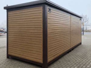 El revestimiento exterior imitación madera aporta un toque de modernidad y naturalidad a tu contenedor. Este acabado resistente a la intemperie se integra armoniosamente en cualquier tipo de entorno, ya sea urbano o exterior.