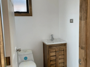 Revestimiento interior osb y volcanita lisa Revestimiento exterior acero plegado negro mate Aislación de poliuretano proyectado en cielo Aislación de lana de vidrio en muros Piso pavimento vinílico tipo click